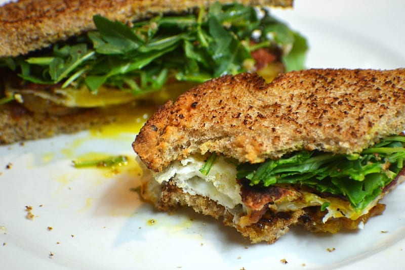 Caramelized Onion, Arugula, Bacon & Egg Sandwich